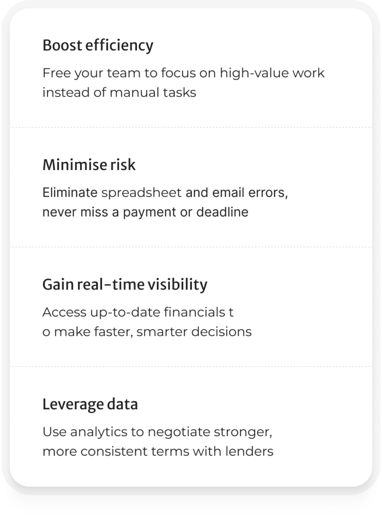 Schedule a live demo to see how the platform streamlines utilisation management, covenant tracking, and document automation — all in one place.