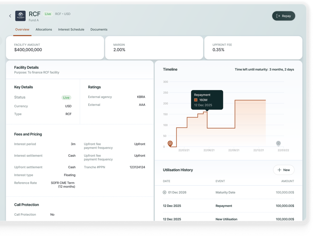 Real-time visibility into your fund finance position: borrowing insight, facility balances, limits and pricing